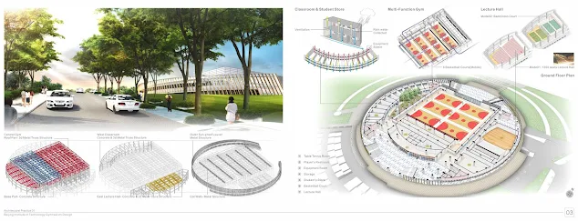 This project is an multi-function gym design for Bejing Institute of Technology in Zhuhi. The major concept comes from the ancient China philosophy "Tai-Chi(Yin-Yang)". The outer cylinder part represents "Yin", and is the space for small activities. The inner cube represents the concept of "Yang" and is the space for large scale sports. Based on the geometry, we can separate this Building into three portions: the central main gym, the east multi-function lecture hall and the west classrooms. The central main gym also has three different using modes- the normal using mode which contains six basketball courts, the gaming mode containing 1200 seats and the 6000 seats gathering mode for graduation ceremony. Eventually this building not only perfectly express the Chinese order and culture, but also satisfies the complex requirements of the client.
